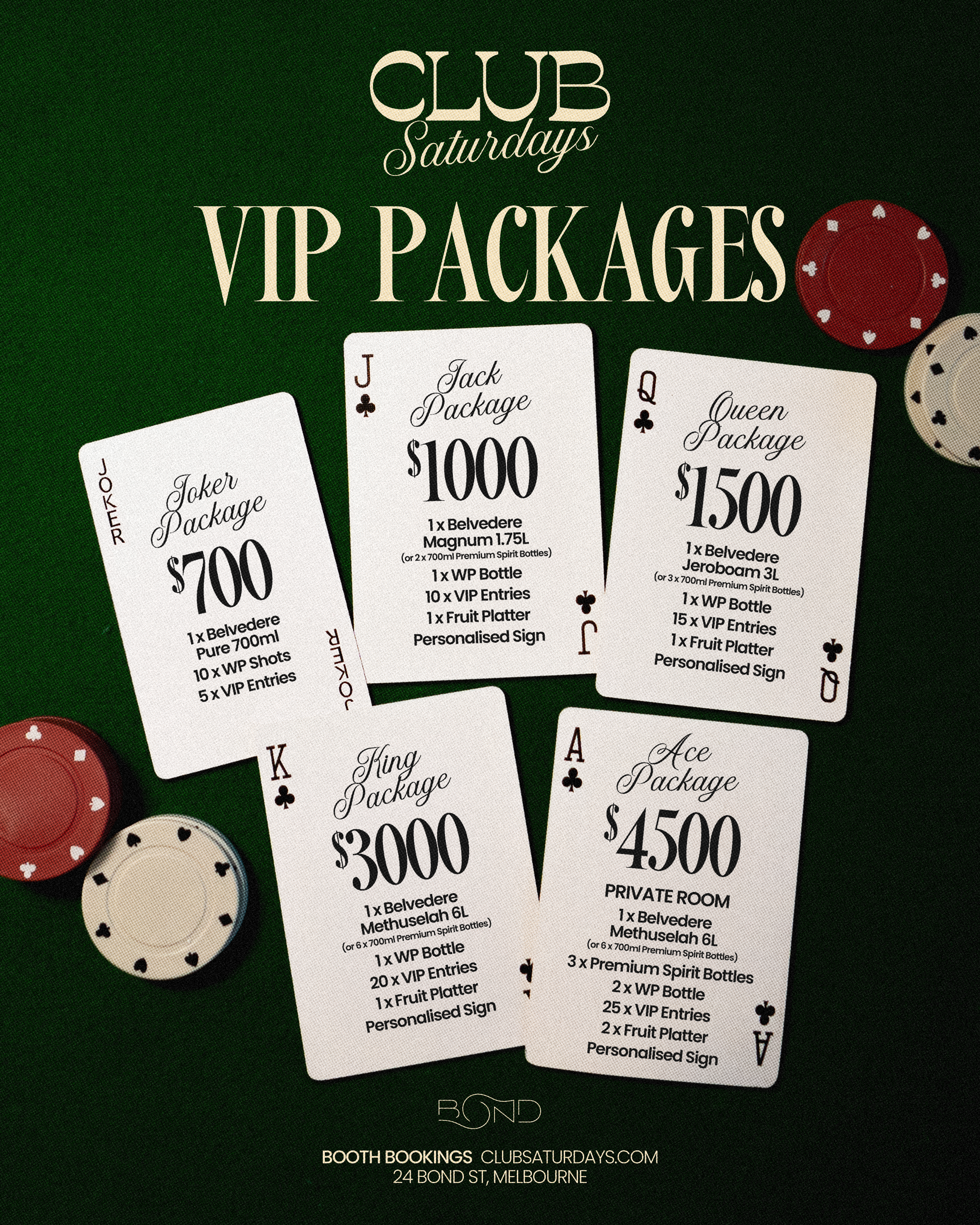Enjoy a private booth or table package starting from $450 amongst Bond Saturdays. You will be greeted by your own personal VIP booth host with premium spirits and French sparkling.